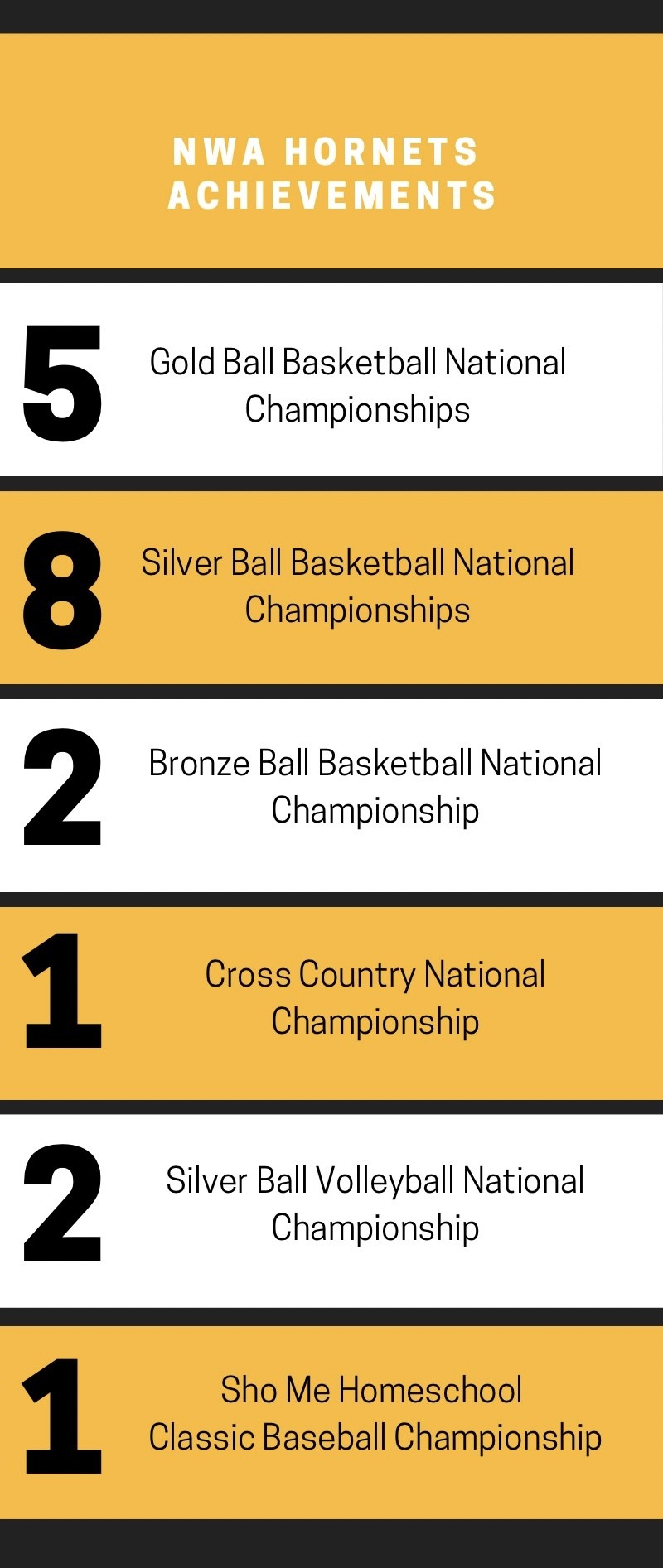 Established in 2011, The purpose of the NWA Hornets is to provide home-educated students in Northwest Arkansas and the surrounding areas the opportunity to achieve their fullest potential in the area of athletics and related activities.